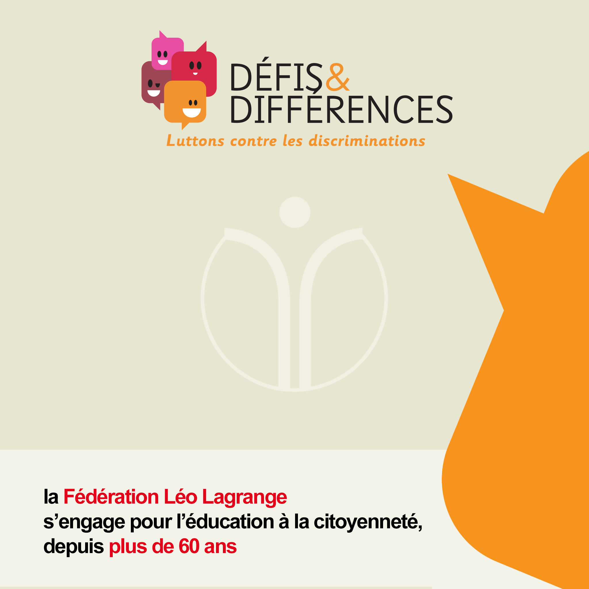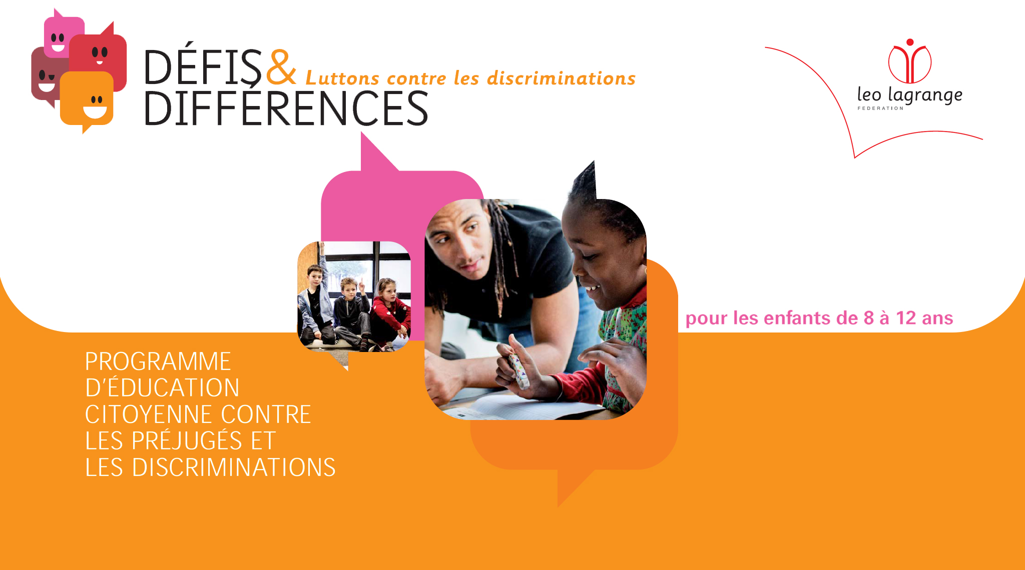 Défis & Différences est un programme de sensibilisation contre toutes les formes de préjugés et de discriminations à destination des enfants de 8 à 12 ans. Initier les enfants à la citoyenneté, dès leur plus jeune âge, répond à une volonté de placer l’enfant au coeur du projet éducatif de la Fédération Léo Lagrange : non pas en tant que simple spectateur, mais bien en tant qu’acteur de son propre épanouissement.